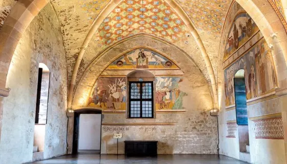 Various rooms and halls open on to the courtyard, among them the awe-inspiring Sala della Giustizia (Hall of Justice), with its overarching vault and lively 13th-century frescoes.