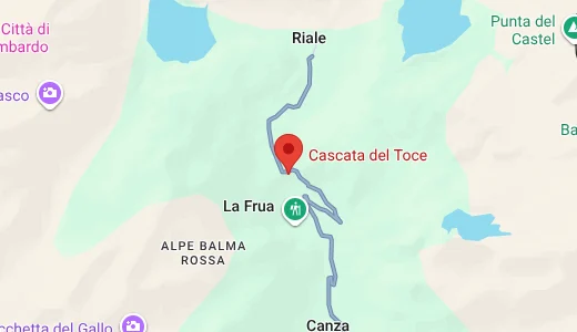 La cascata considerata tra le più spettacolari delle Alpi, la Cascata del Toce, si trova in Val Formazza, nella località La Frua (1861 m), a circa 1 ora e 30 minuti da Stresa. È un ottimo punto di partenza per lunghe escursioni alla scoperta dei più bei laghi alpini della valle.